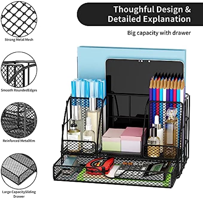 【Desk Pen Organizer Sturdy Durable】: Desk caddy is made of high quality metal, adopting with a powder coat finish and electroplating technology, wear-resistant, anti-oxidation, long lasting and does not fade, desktop organizer and Accessories the extremely smooth edges, will not hurt your things or yourself, and protect your desk.