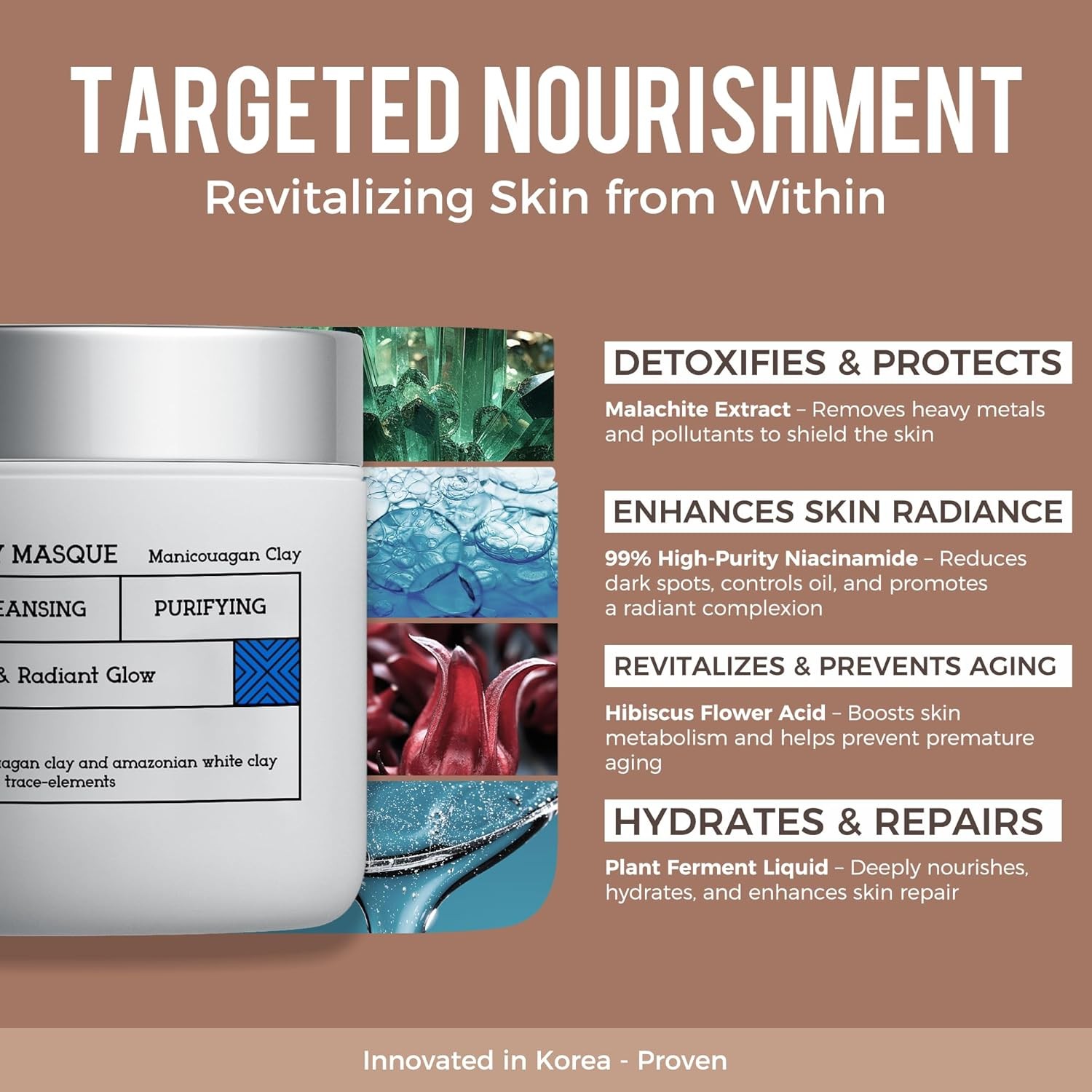 Deep Cleansing & Pore Purification: Amazon White Clay, Dead Sea Mud, and Canadian Glacial Mud work together to deeply cleanse pores, removing excess oil, dirt, and blackheads. Ideal for oily and acne-prone skin, this mask regulates oil production, prevents clogged pores, and leaves the skin fresh and smooth