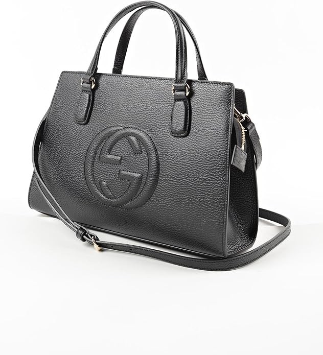 • This beautiful Gucci Soho Tote with embossed interlocking GG logo is a stunning addition to any handbag collection. Crafted in beautiful black calfskin leather this beautiful piece can be carried by hand or by the detachable leather shoulder strap.